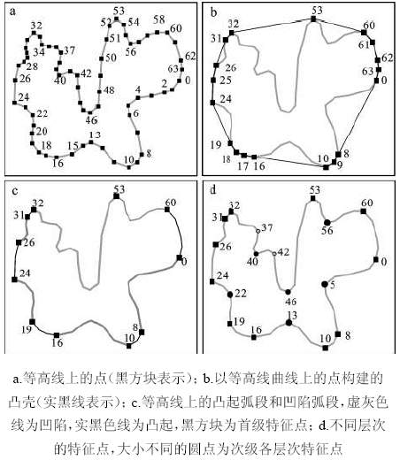 Fig.1 Recognition of multi-hierarchical characteristic points and segmenting of a contour图1 等高线特征点的识别过程及曲线的分段 |