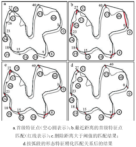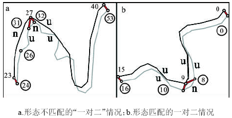 Fig.4 Refining one to two matching relation of characteristic points according to shape character图4 根据弧段形态精细化特征点的一对二情况 |