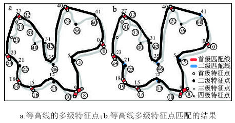 Fig.5 Multi-hierarchical characteristic points of correspondence contour and their matching results图5 两个同名等高线的多级特征点及其匹配的结果 |