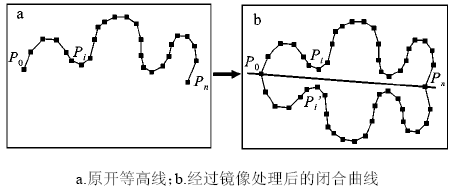 Fig.6 The open contour is processed into close curve through mirroring with the axis of symmetry including starting and ending points图6 开等高线经过镜像处理后构成闭合曲线 |