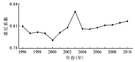 Fig.2 The Gini of tourism economy in the Huanghe River Basin图2 黄河流域旅游经济基尼系数变化 |