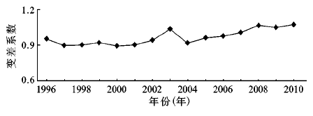 Fig.1 The VOC of inbound tourism in the Huanghe River Basin in 1996-2010图1 1996~2010年黄河流域旅游经济标准差变化 |