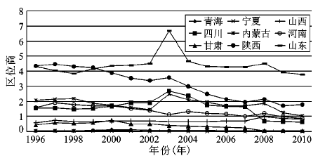 Fig.4 The location quotient of the Huanghe River Basin图4 1996~2008年黄河流域旅游经济区位商 |