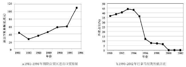 Fig.2 Imports and exports of Colon Free Trade Zone and the percentage of short-term foreign debt to total debt in Panama图2 科隆自贸区进出口贸易额统计及巴拿马短期外债占总外债的百分比 |