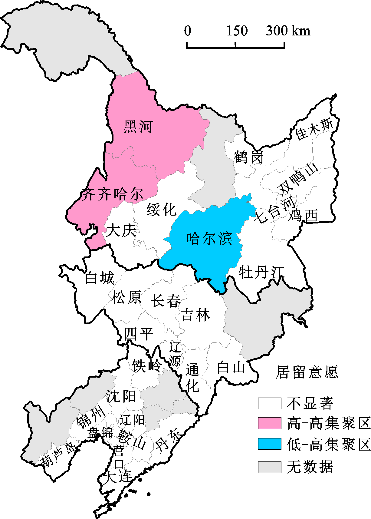 In recent years, the three provinces of Northeast China (Liaoning, Heilongjiang, and Jilin) have suffered from economic decline and labor force loss. Supported by the China migrants dynamic survey in 2015, the present study aims to examine the spatial pattern and driving forces of the settlement intention of the floating migrants in the three provinces of Northeast China. Spatial autocorrelation analysis and trend analysis methods are applied to characterize the spatial pattern of the settlement intention at the city level, and a binary logistic model is constructed to detect the drivers of the settlement intention at the micro-level. According to the aboveanalyses, the main findings of our research are as follows: 1) The spatial distribution of the settlement intention of the floating population in three northeastern provinces presents a characteristic of “higher in the north and lower in the south”. Besides, the settlement intention has a more significant spatial variation in the north-south direction, yet the spatial variation degree is weaker in the east-west direction. 2) The spatial autocorrelation is insignificant in the spatial pattern of floating migrants’ settlement intention in the three provinces of Northeast China. Qiqihar City and Heihe City are detected as the High-Low cluster areas, while Haerbin City is detected as the High-High cluster area. With the increase in the size of cities, the settlement intention of the floating population shows the trend of first rising and then declining. From the perspective of the city level, the settlement intention of the floating population in sub-provincial cities is higher than that of ordinary prefecture-level cities in the three provinces of Northeast China. 3) Individual, economic, and social factors show significant effects on the settlement intention of floating migrants in the three provinces of Northeast China. In terms of individual factors, the model results indicate that migrants with agricultural hukou, migrants who are married, highly educated migrants, and ‘80s’ migrants have a stronger willingness to stay in destination cities. 4) For economic factors, income level has a significantly positive relationship with the settlement intention of the floating population, while housing expenditure has a negative effect. 5) Considering social factors, the results show that migrants with longer duration of staying, migrants whose occupation categories are professional or technical personnel and business service personnel, migrants whose employment status is the employer, and migrants participating in urban employee medical insurance have a stronger settlement intention.