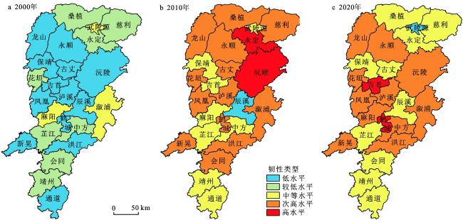 图2 2000—2020年湘西地区旅游环境系统韧性空间分布湘西土家族苗族自治州(龙山、永顺、保靖、花垣、凤凰、泸溪、古丈分别为龙山县、永顺县、保靖县、花垣县、凤凰县、泸溪县、古丈县;吉首为吉首市);张家界市(永定为永定区;武陵源为武陵源区;慈利为慈利县;桑植为桑植县);怀化市(鹤城为鹤城区;中方、沅陵、辰溪、溆浦、 会同、麻阳、新晃、芷江、靖州、通道分别为中方县、沅陵县、辰溪县、溆浦县、会同县、麻阳苗族自治县、新晃侗族自治县、 芷江侗族自治县、靖州苗族侗族自治县、通道侗族自治县;洪江为洪江市) Fig. 2 Spatial distribution of the resilience of tourism environment system in Xiangxi Area from 2000 to 2020 |