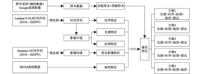 由于云污染、实地验证点的匮乏,以及地形地貌的复杂、破碎化,多云山区土地覆被的准确分类较难实现。以藏东南这一典型的多云山区及生态过渡区为研究区,基于Google Earth Engine(GEE)平台和野外实测数据,结合多光谱数据、雷达数据、高程数据、辅助数据,提取光谱特征、纹理特征、地形特征等信息,利用递归特征消除法对特征进行优化,并采用随机森林算法构建分类模型,以期有效利用多源遥感数据提高土地覆被分类精度。结果表明:① 并非特征越多分类精度越高,特征选择后数量由58个减至38个,分类精度(总体精度93.96%,Kappa系数0.92)较未优化前(总体精度93.11%,Kappa系数0.92)略有提升。② 地形特征及雷达特征对藏东南土地覆被分类具有重要作用,地形特征对多数土地覆被类型的分类精度具有影响,而雷达数据对裸地、建设用地、灌丛影响较大,分类过程中如不考虑地形及雷达特征,总体精度分别降至88.98%,92.48%。纹理特征以及时序特征仅对提高具有明显纹理以及时序变化的土地覆被类型的精度有帮助。结合随机森林和特征优化算法,能够在保证土地覆被分类精度的同时,高效整合多源数据信息,加快模型运算速度,为多云山区土地覆被分类提供切实可行的方法。