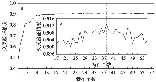 图3 不同特征条件下随机森林分类精度变化b为a在特征个数为17~55的局部放大,虚线用来标明交叉验证精度最高时对应的特征个数 Fig. 3 Accuracy variation of random forest classification under different feature schemes |