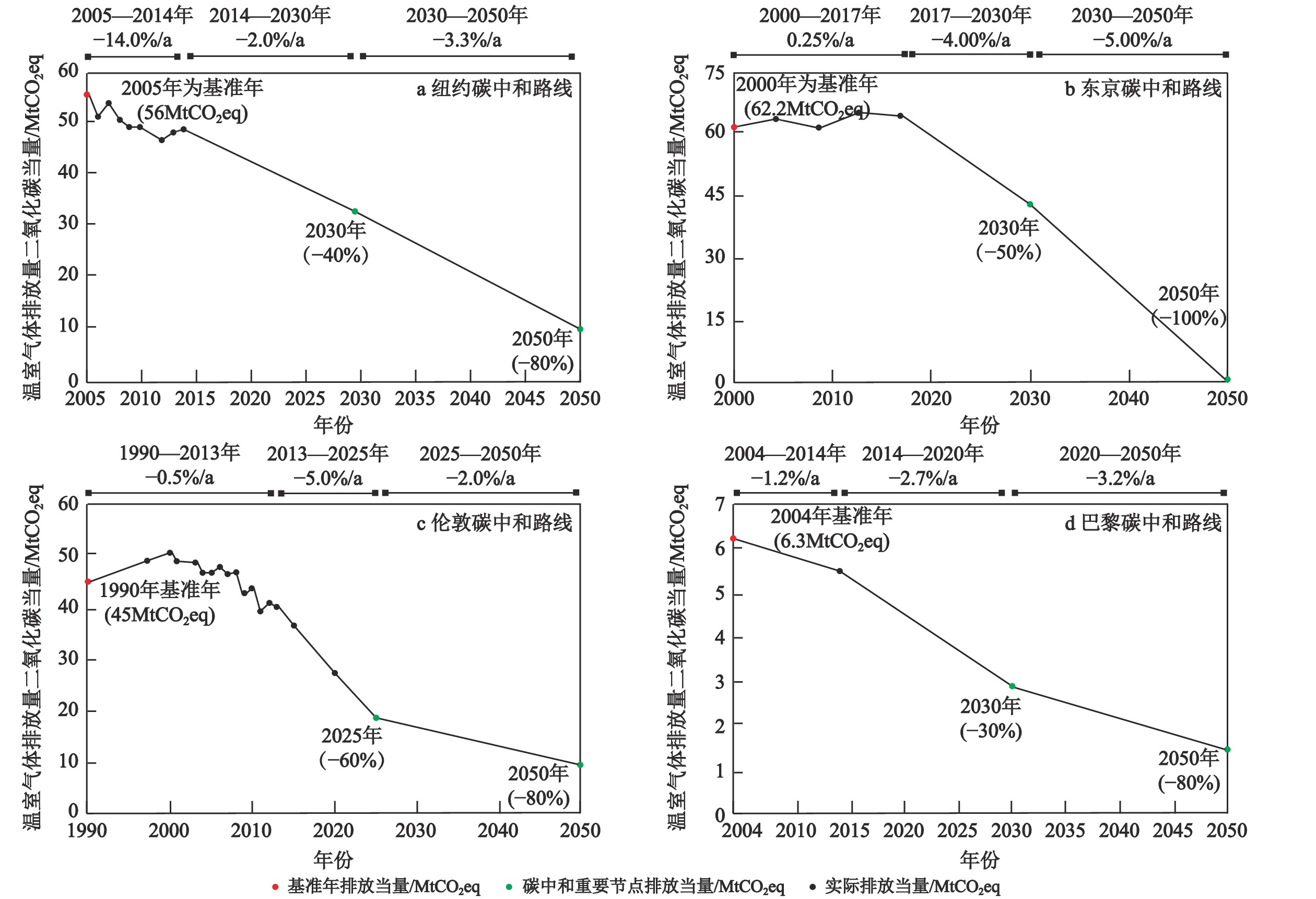 | 4 | 巴黎 | 2004年/ 28.3Mt | ① 2020年是加速发展阶段,迫切的能源变革需求;②有效行动阶段(2020—2030年),开发雄心勃勃的可实施的行动计划;③ 愿景(2030—2050年),将巴黎打造成韧性、包容、碳中和城市,实现100%可再生能源 | ① 能源领域:建立能源新政策;发展太阳能、风力和生物质发电;开发地下能源存储系统;2050年能源消费降低50%,可再生能源占比100%;2030年前所有能源系统完成智能改造,节能50%以上;② 交通领域:2020年建成骑行友好城市,2025年淘汰柴油车;2040年淘汰汽油车,支持建设远程办公中心;③ 建筑领域:修改现行法规,对既有建筑进行能源改造,推广新节能标准和规范;2050年,完成100万户生态改造,所有新建建筑均为低碳、主动能源建筑;④ 城市规划:调整规划以适应气候变化,城市规划和土地利用规划中推广碳中和示范项目,改善城市生态空间和人居环境;⑤ 废弃物处置:2020年将回收站数量增加到20座,堆肥站增至1000座;⑥ 食品行动:到2030年将食品相关的温室气体排放降低40% |