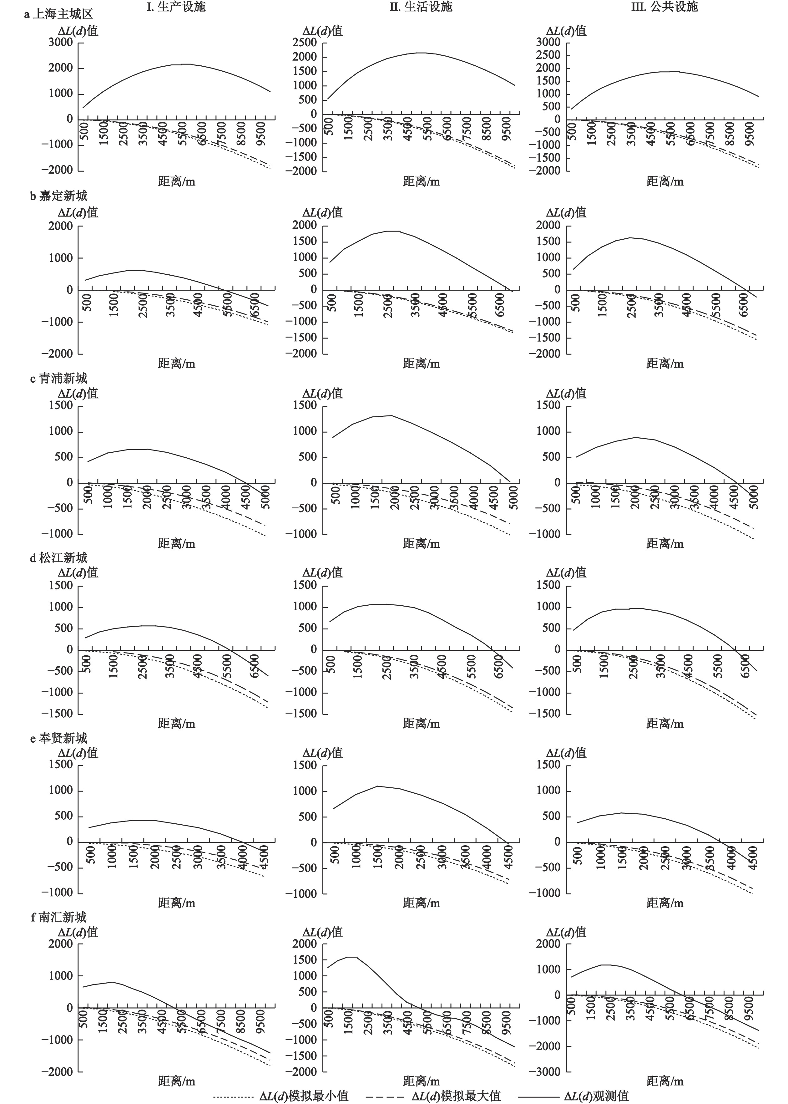 本文基于高德地图兴趣点(POI)数据,将其分为生活、生产、公共3类设施,采用核密度估计法、Ripley’s K函数等空间分析方法,并设计了一个反映设施类型结构在空间中演化的三角轨迹模型,以上海主城区为参考,基于不同类型设施的数量、分布和聚集程度,分析了上海五个新城的设施空间结构特征和分布规律,探讨了五个新城进一步建设的方向。研究发现:与上海主城区相比,五个新城的设施空间分布特征差异明显,发展历史较长的新城已经出现明显的单中心空间结构,而发展历史较短的新城表现为微弱的多中心结构;从设施高密度圈层到低密度圈层,主城区的设施类型结构变化较小,表现出内部“城市功能趋同”的特征,而五个新城则均表现出生活设施的占比逐步降低而公共设施和生产设施的占比升高的趋势,新城之间呈现“扩张结构趋同”的特征;新城的高密度圈层中,生活设施占比均高于主城区水平,表现出一定的“卧城”特征;低密度圈层中,尽管生产设施占比均高于高密度圈层,但不同类型设施聚集中心高度重合表明生产设施的聚集中心同样在新城的中心区,其外围城市功能薄弱,并没有出现完善的“专业功能中心”。因此,新城的进一步建设需强调设施的均衡协调发展,完善城市功能,避免出现“卧城”“空城”等现象。