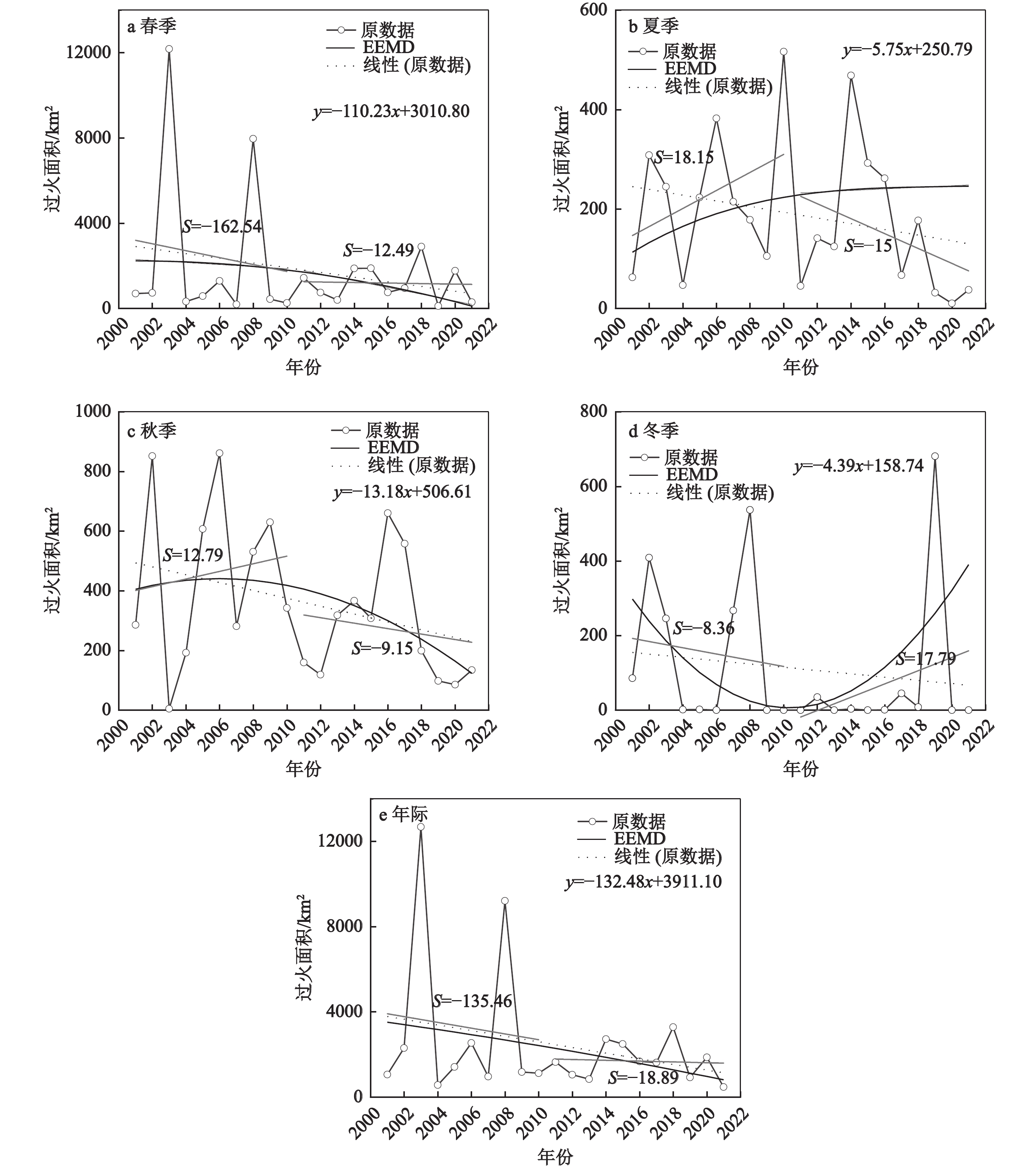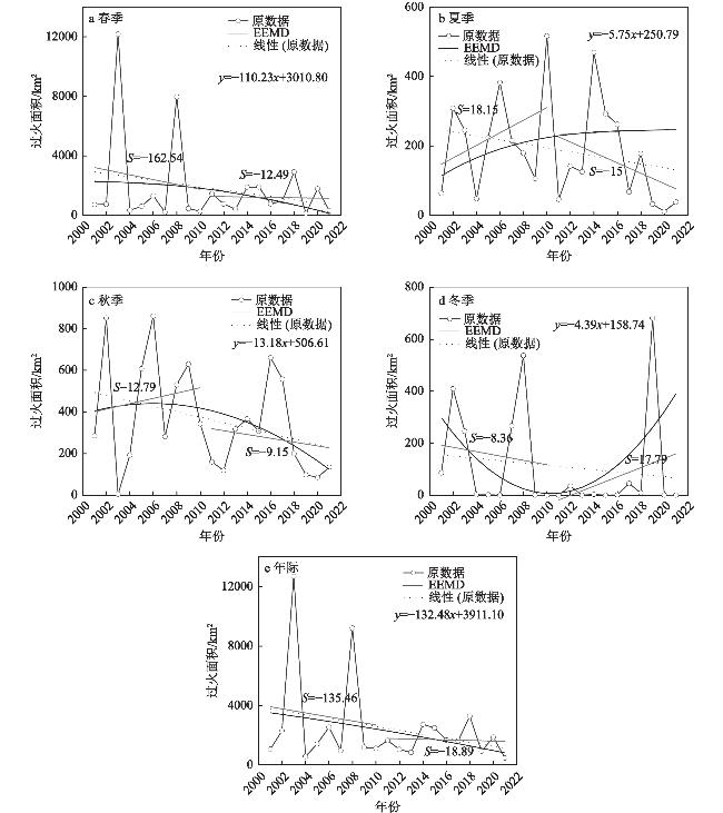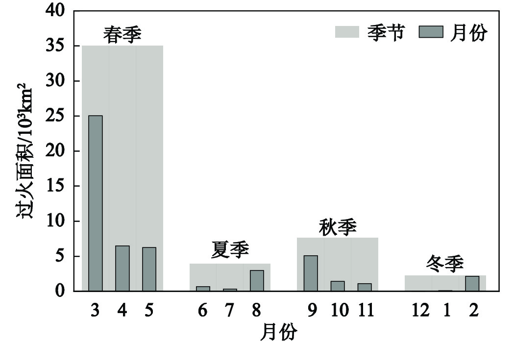 本文基于MCD64A1火烧迹地数据,采用空间分析法和集合经验模态分解法分析大兴安岭野火时空格局演变,利用逻辑回归模型,揭示影响大兴安岭野火发生的关键因素。结果表明:2001—2021年大兴安岭野火过火面积总体呈递减趋势,季节变化表现为主要集中在春秋两季,其中春季过火面积占全年的73%。从空间分布上看,大兴安岭春季野火主要聚集于研究区东北部以及中部区域,而夏、秋、冬季野火则多集中在研究区中部。此外,春秋两季野火在空间上呈较高的聚集性。近20 a研究区37%的区域野火面积呈上升趋势,而63%的区域呈减少趋势。按影响因子对野火发生概率的影响程度大小排序依次为:居民点密度>月总降水量>水系网密度>月平均饱和水汽压差>植被类型>坡向>月平均风速>坡度>道路网密度>海拔高度,表明大兴安岭人为因子、与湿度相关的因子以及植被因子是野火发生的关键影响因素。
