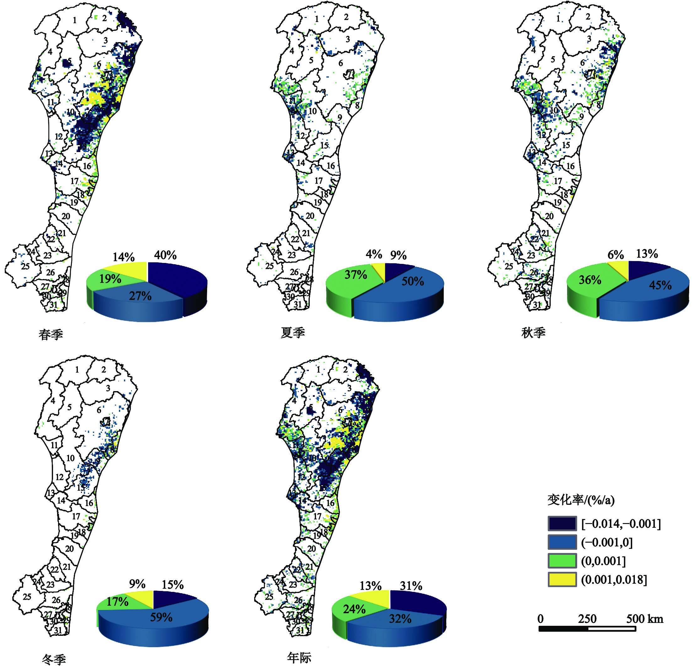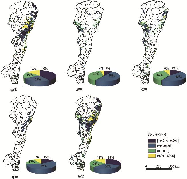 图6 2001—2021年大兴安岭不同季节野火面积占比的空间变化率1漠河市;2塔河县;3呼玛县;4额尔古纳市;5根河市;6鄂伦春自治旗;7加格达奇区;8莫力达瓦达斡尔族自治旗;9阿荣旗;10牙克石市;11陈巴尔虎旗;12鄂温克族自治旗;13新巴尔虎左旗;14阿尔山市;15扎兰屯市;16扎赉特旗;17科尔沁右翼前旗;18突泉县;19科尔沁右翼中旗;20扎鲁特旗;21阿鲁科尔沁旗;22巴林左旗;23巴林右旗;24林西县;25克什克腾旗;26翁牛特旗;27赤峰市区;28敖汉旗;29朝阳市建平县;30喀喇沁旗;31赤峰市宁城县 Fig. 6 Spatial change rate of wildfire area proportion in different seasons in the Da Hinggan Mountains from 2001 to 2021 |