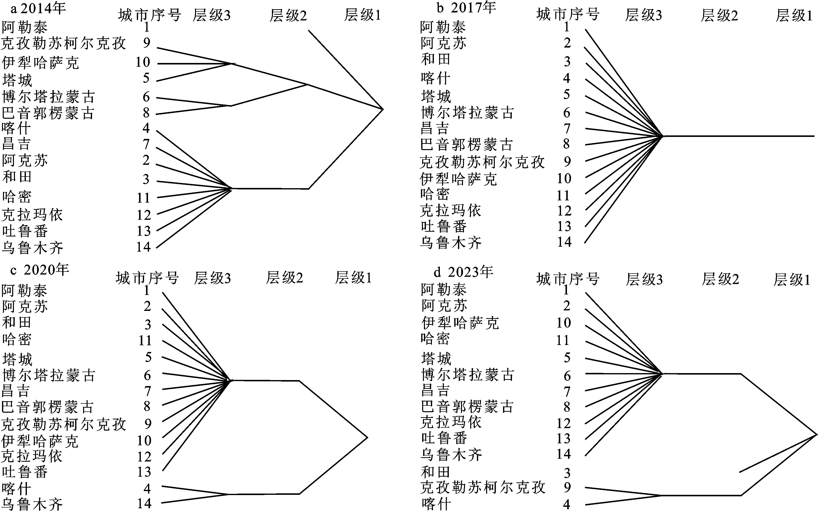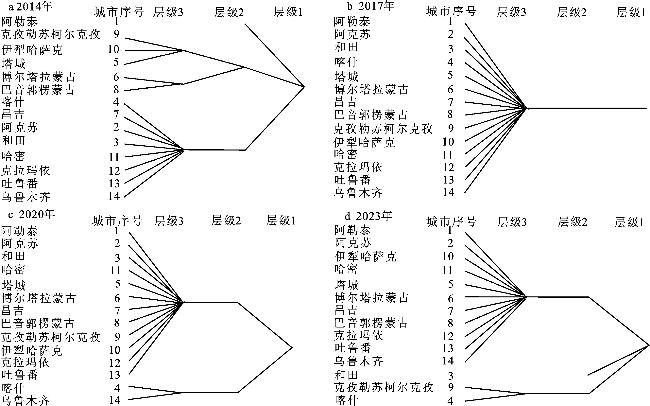 图2 新疆旅游信息流网络凝聚子群分析Fig. 2 Analysis on cohesive subgroups of tourism information network in Xinjiang |