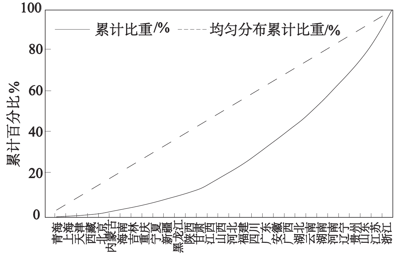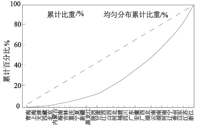 | 省份 | 度假区数量/家 | 占全国 比重/% | 累计 比重/% | 均匀分 布累计 比重/% | ||