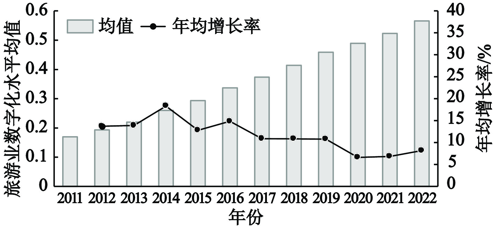 表1 旅游业数字化水平综合评价体系及权重Table 1 Comprehensive evaluation system and weights of digitalization level of tourism industry |