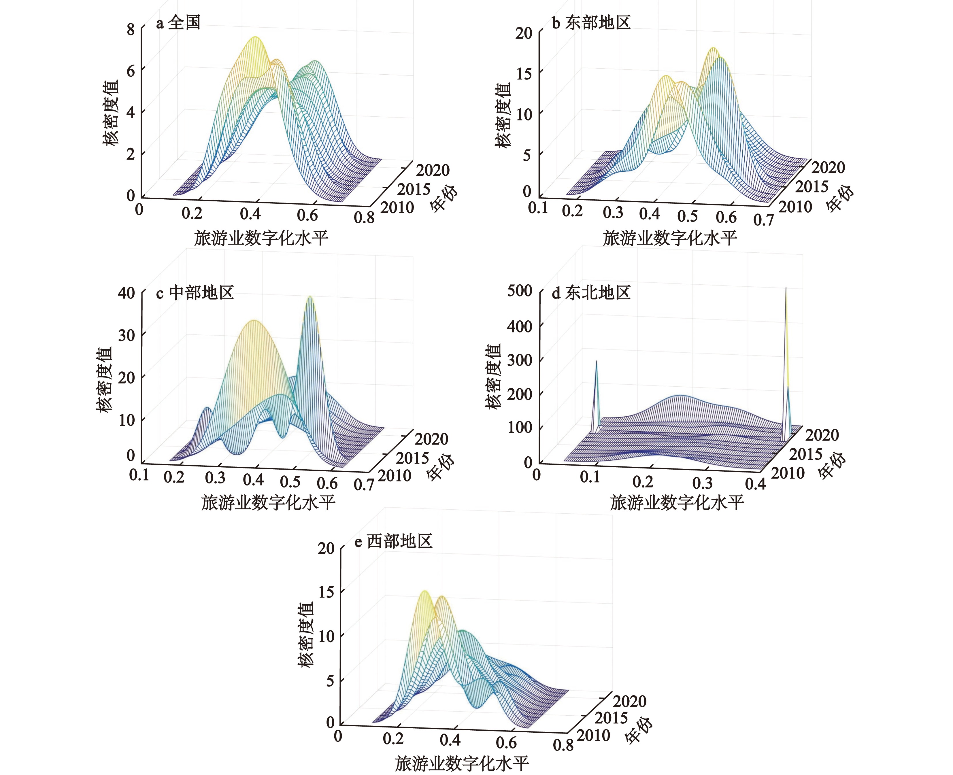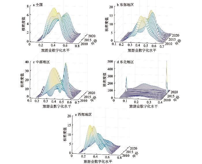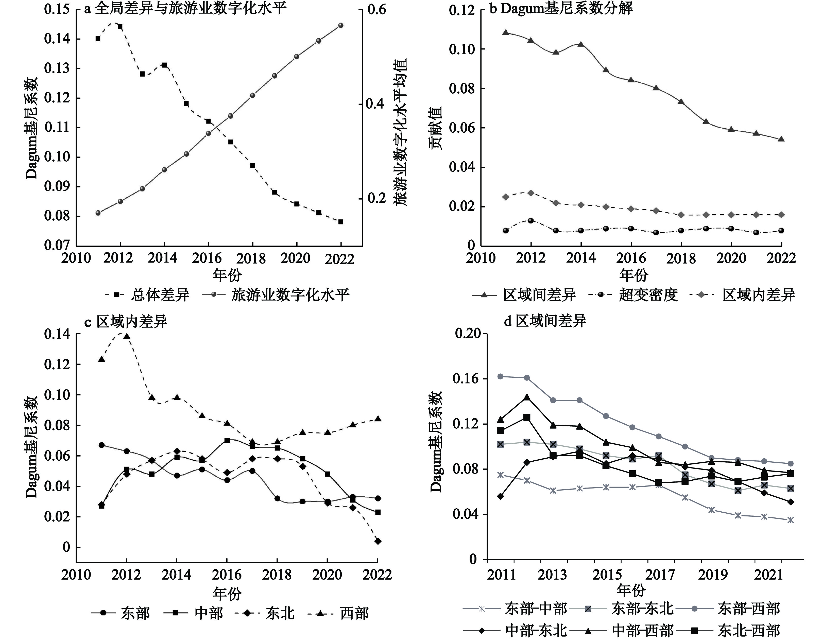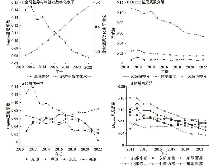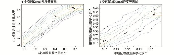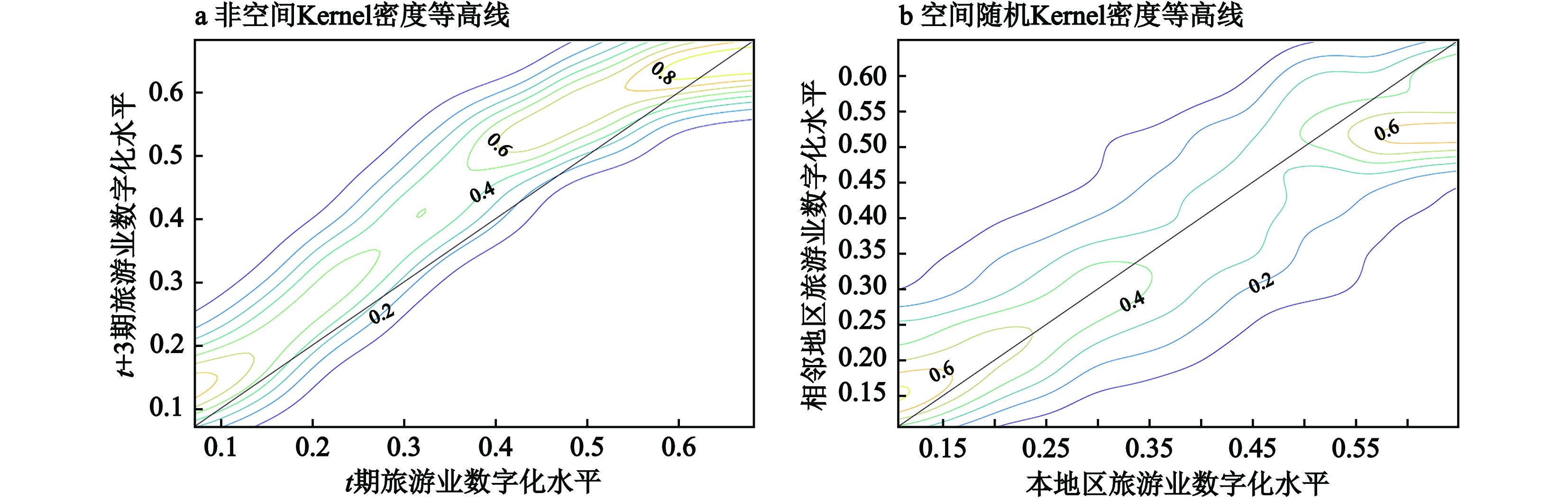 辨识旅游业数字化发展的空间非均衡性特征,可为弥合旅游产业“数字鸿沟”、优化旅游业新质生产力空间布局提供科学依据。基于旅游业数字化的内涵特征构建综合评价指标体系,采用熵权TOPSIS法、Dagum基尼系数、Kernel密度估计和Markov链分析法探究了2011—2022年中国旅游业数字化水平的空间非均衡性特征及其动态演化趋势。结果表明:①中国旅游业数字化水平呈稳步增长态势,存在“东高西低、南高北低”的空间分异特征。②中国旅游业数字化水平总体差异呈波动下降状态,区域内呈“东北>东部>西部>中部”的差序格局,省际间差距是旅游业“数字鸿沟”扩大的主要来源。③条件概率密度曲线沿45°对角线两侧分布,旅游业数字化水平的分布动态相对稳定;在纳入地理空间因素后,中国旅游业数字化水平表现出敛缩态势。④不考虑地理空间效应,中国旅游业数字化水平长期存在“马太效应”和“俱乐部趋同现象”,随着相邻省份空间滞后类型水平的提升,旅游业数字化水平受相邻省份的空间溢出效应影响显著。