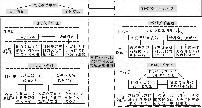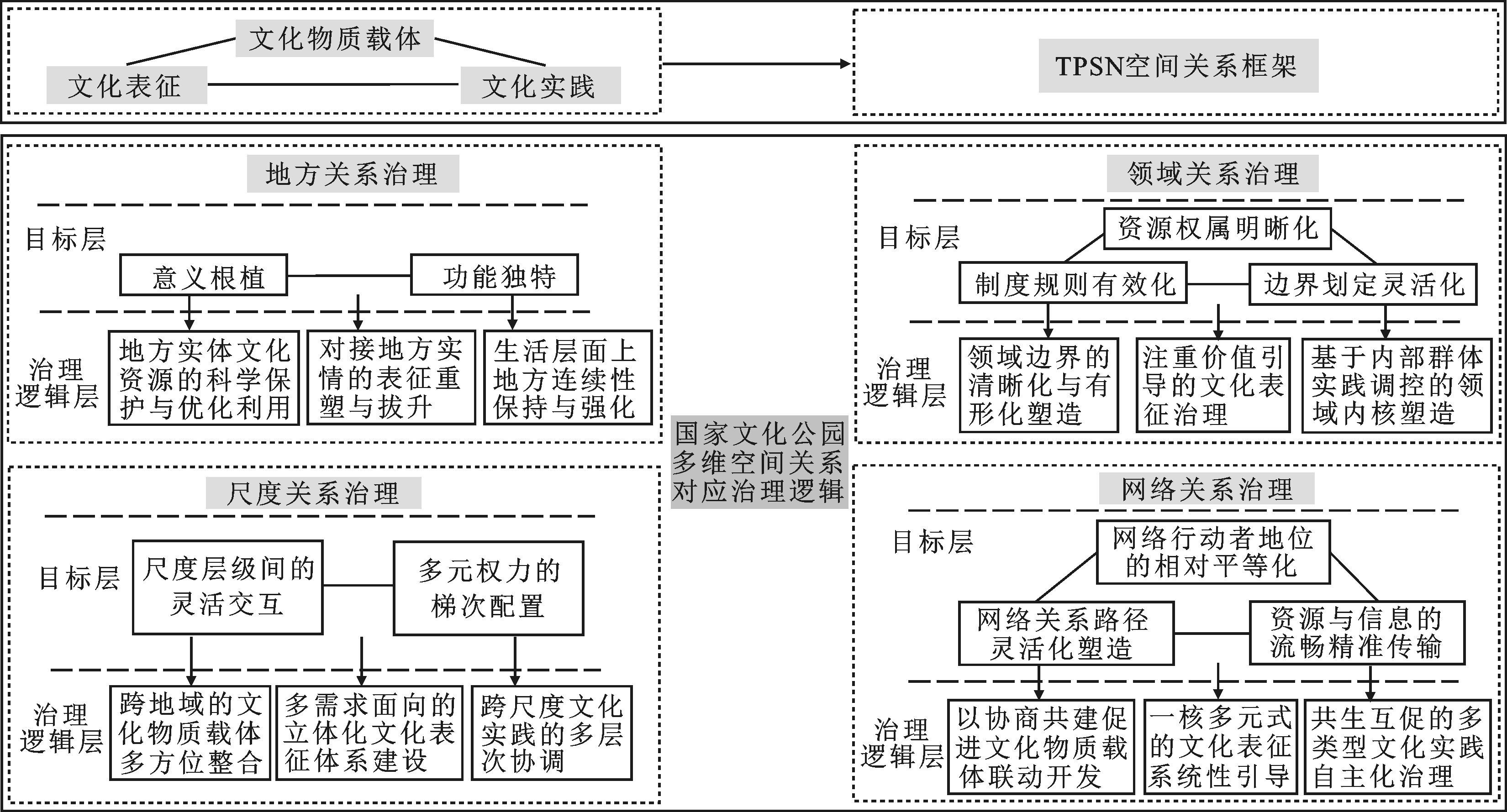 The national cultural park is an innovative outcome formed through the efficient protection and utilization of large-scale cultural heritage and resources in China, through localization practices and international exchanges. On the basis of reviewing the existing research achievements in cultural space, this study adopts the TPSN spatial relations theory and the cultural structure theory, utilizes Cross-Analysis based on spatial dimensions of territory, place, network, scale, as well as the cultural dimensions of cultural material carriers, cultural representations, and cultural practices, and constructs a general governance logic for the multidimensional spatial relations of national cultural parks. Furthermore, the breakthrough directions and action routes for the spatial relations governance of the 5 national cultural parks have been explored. It has been found that the spatial relations of current national cultural parks follows 2 types of spatial generative orders: place guided order and network guided order, and due to differences in practical conditions, 3 spatial relations governance focuses have been formed: place, scale, and network. At the same time, the functional connotations of various spatial relations maintain high consistency in different national cultural parks governance contexts. Place relations are the main carriers of the vast majority of cultural resources and constitute the key core of the attractiveness of national cultural parks. Territory relations reflect the recognition and adjustment of place relations by diverse power entities, and preliminarily stipulate the operational rules and adjustment methods of various governance objects. The scale relations focuses on the nested combination of various spatial elements and their governance strategies at different levels, which is a key tool for connecting and integrating governance fields. Network relations are the fundamental relations that ensure the normal operation of other spatial relations and run through the entire process of national cultural parks governance.