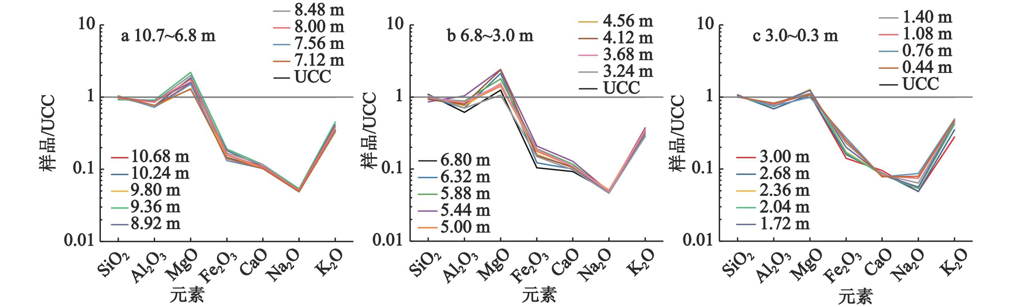 | 层号 | SiO2/% | Al2O3/% | Fe2O3/% | MgO/% | CaO/% | Na2O/% | K2O/% |
