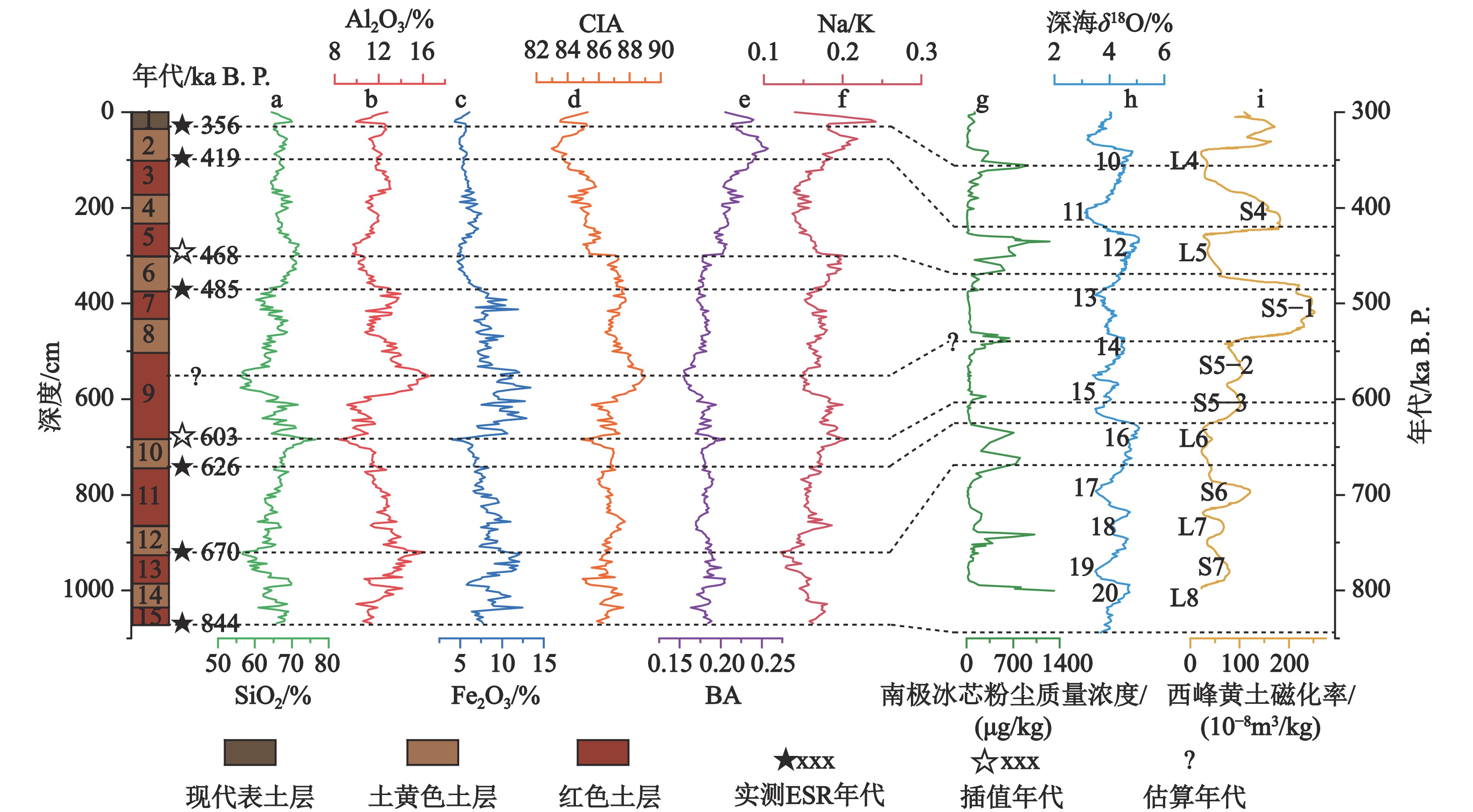 基于电子自旋共振(ESR)测年和元素地球化学测量,研究了安徽宣城电厂红土剖面的风化特征及其古气候意义。研究结果表明:①电厂红土剖面自下而上Al2O3含量、 Fe2O3含量和CIA值波动减小,而SiO2含量、BA值、Na/K值和Mg/Ca值波动增大,据此可划分为3个层段,即层段 Ⅰ(10.7~6.8 m)、层段 Ⅱ(6.8~3.0 m)和层段 Ⅲ(3.0~0.3 m);②电厂红土剖面层段Ⅰ的年代区间约为(844 —603) ka B. P.,风化程度较强;层段Ⅱ的年代区间约为(603 —468) ka B. P.,风化程度达到最强;层段Ⅲ的年代区间约为(468 —356) ka B. P.,风化程度逐渐减弱;③在气候要素组合中,降水对电厂红土剖面风化程度的控制作用较温度更为突出,据此推断出区域降水的变化特征,即(844 —603) ka B. P.区域降水较多、气候较为湿润,(603 —468) ka B. P.区域降水最多、气候最为暖湿,而(468 —356) ka B. P.区域降水较少、气候逐渐转干。④电厂红土剖面风化指标与全球古气候记录(大陆冰芯、深海岩芯、陆地黄土)可能具有负相关关系,其相对湿期基本对应于全球冰期和黄土堆积期,而其相对干期则对应于全球间冰期和古土壤发育期。