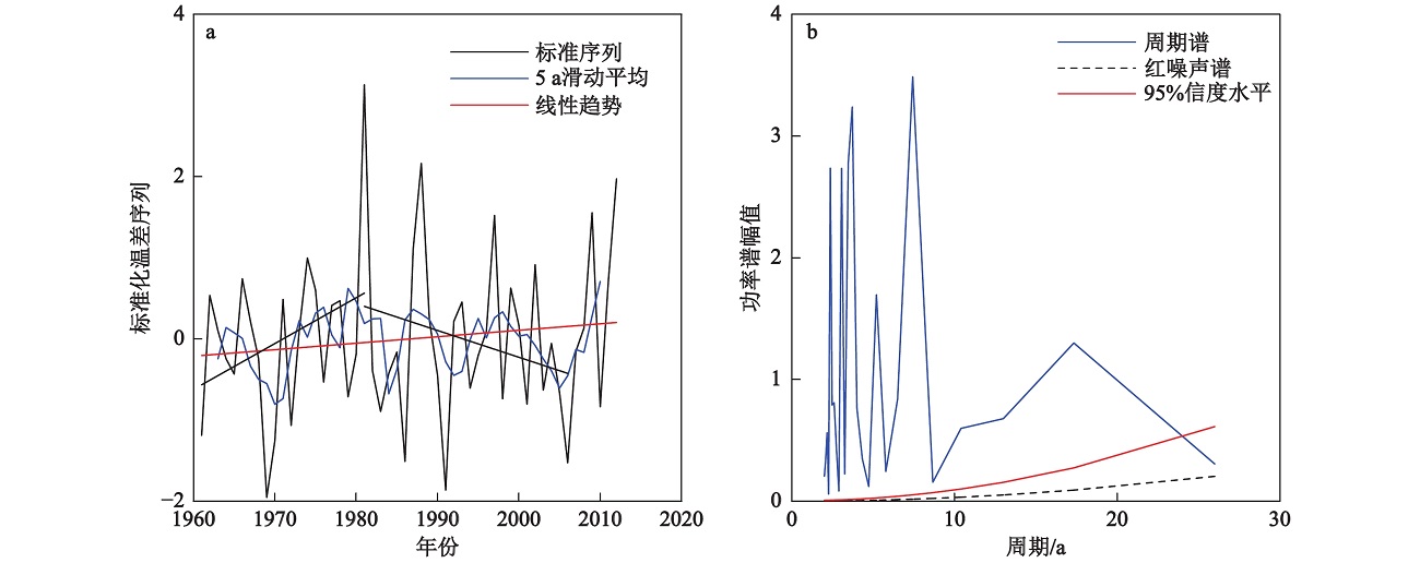 局地纬向海陆温差标准化指标序列(a)与周期谱(b)