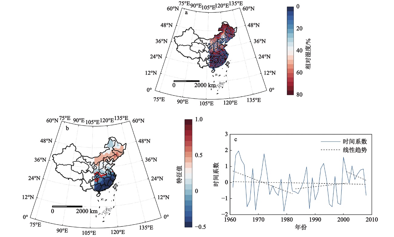 中国东部冬季相对湿度(a)、异常变化主模态(b)分布及时间系数变化(c)