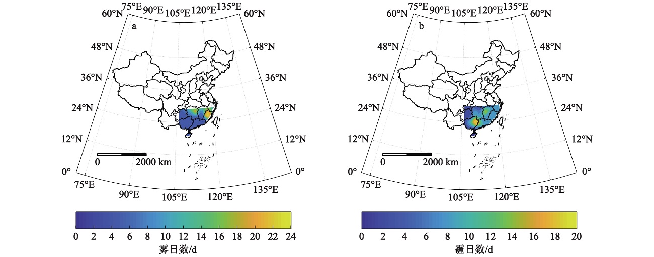 华南地区冬季雾日数(a)与霾日数(b)分布