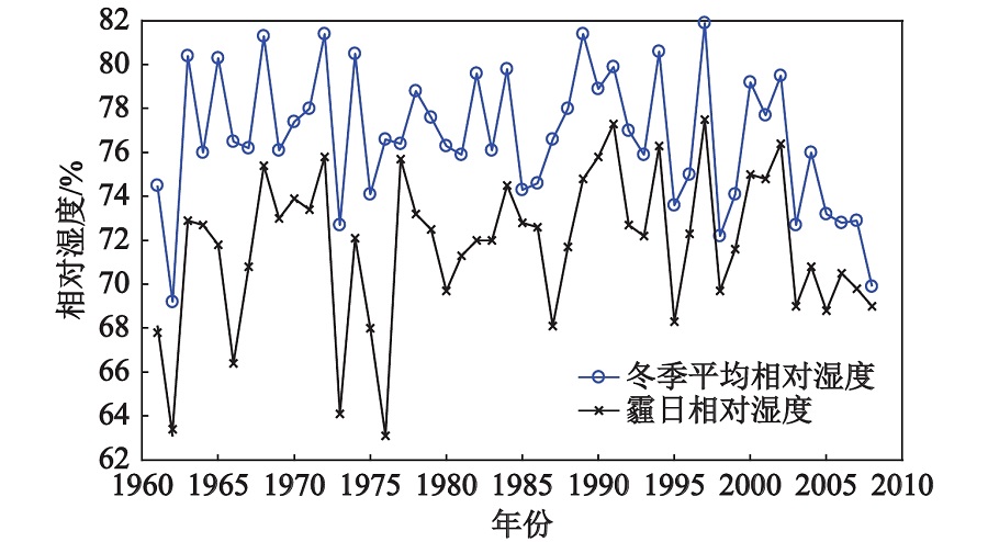 华南冬季平均相对湿度和霾日相对湿度变化