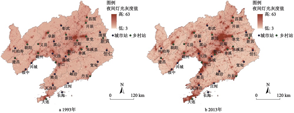 1993和2013年辽宁省夜间灯光灰度值及城市站、乡村站分布