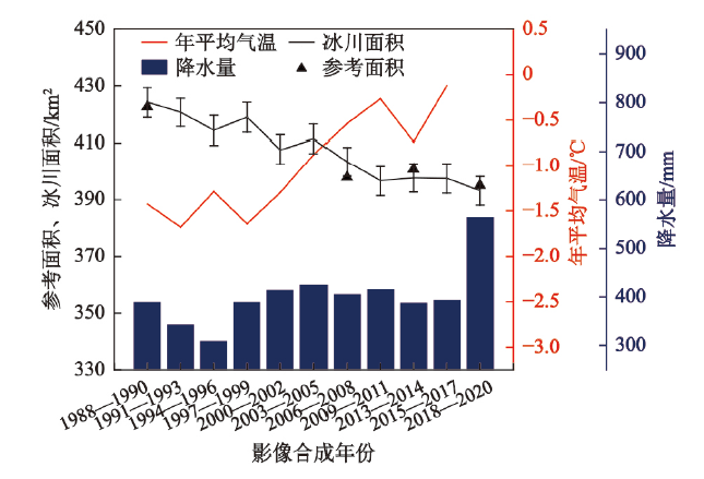 1988—2020年普若岗日冰川面积及站点年均温和降水量变化