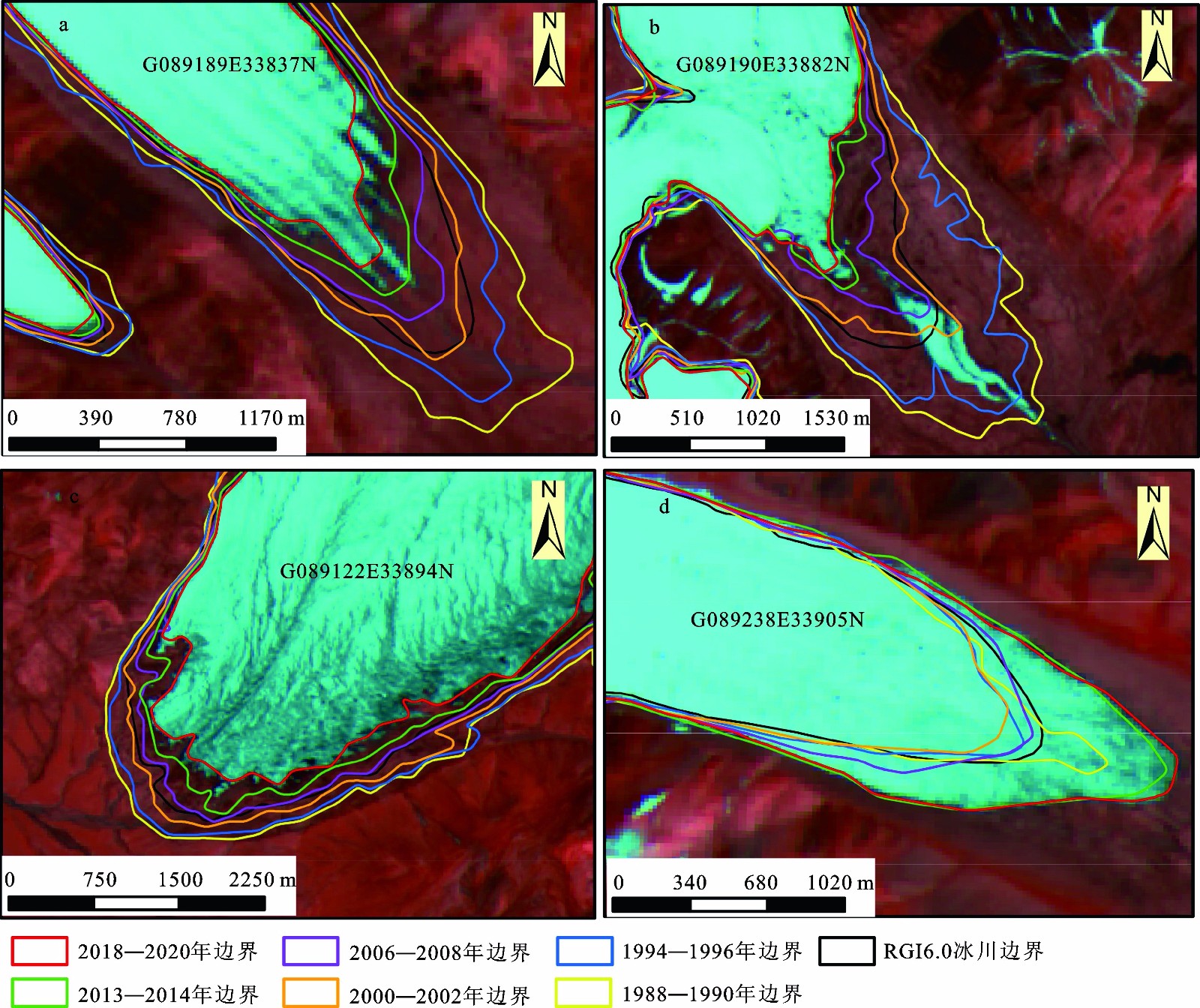 1988—2020年普若岗日典型冰川末端前进(d)及退缩(a,b,c)情况