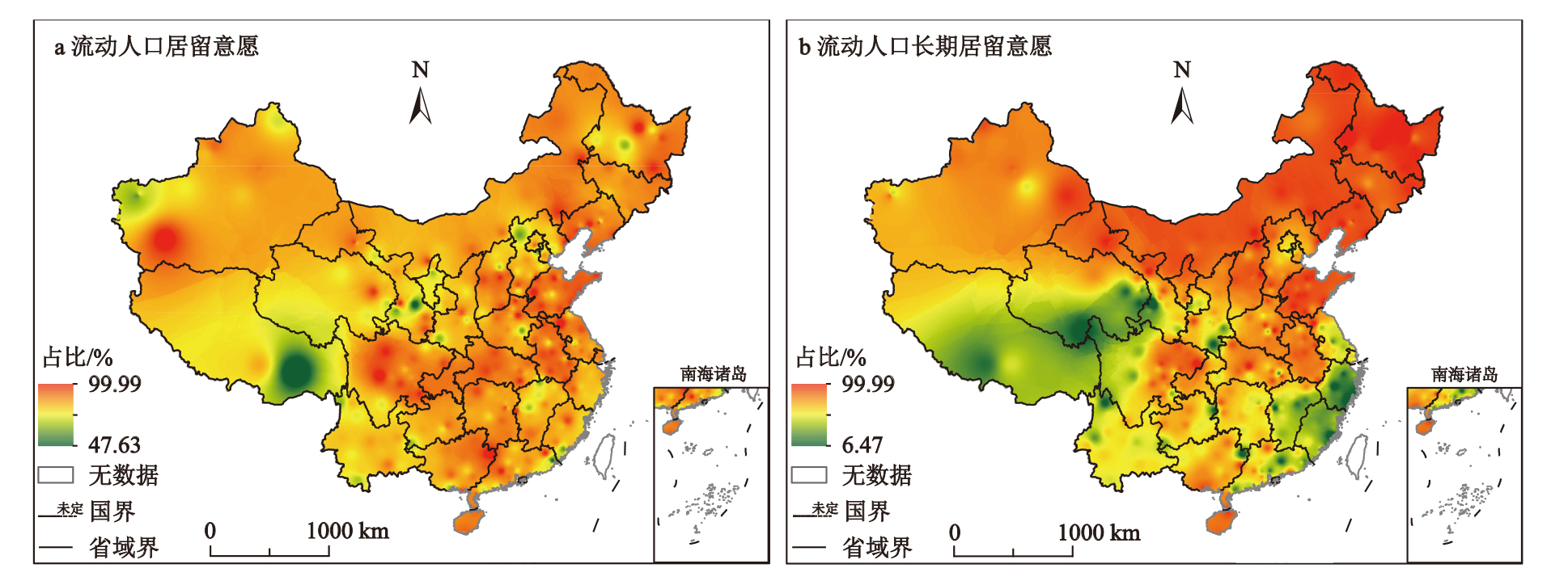 具有居留意愿及长期居留意愿的流动人口占比插值图