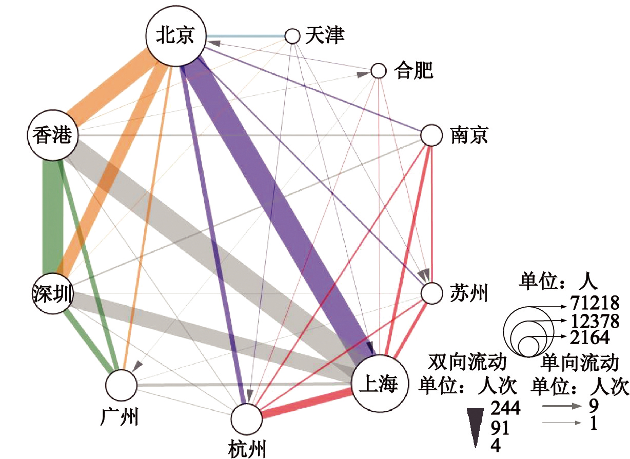 城市之间的连线颜色用于区分不同地区内部/之间的数字人才流动