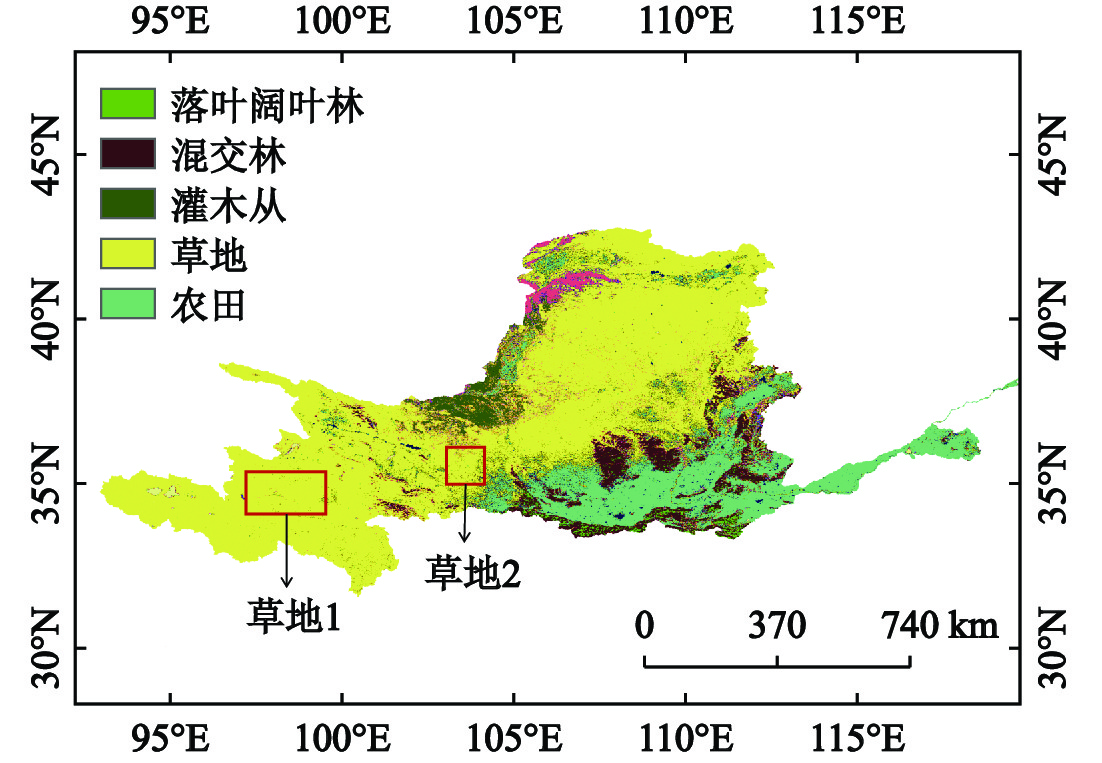 2个矩形框内是为草地类型选取的区域,对草地以外的其他植被类型则选取各类型在流域内的全部像元