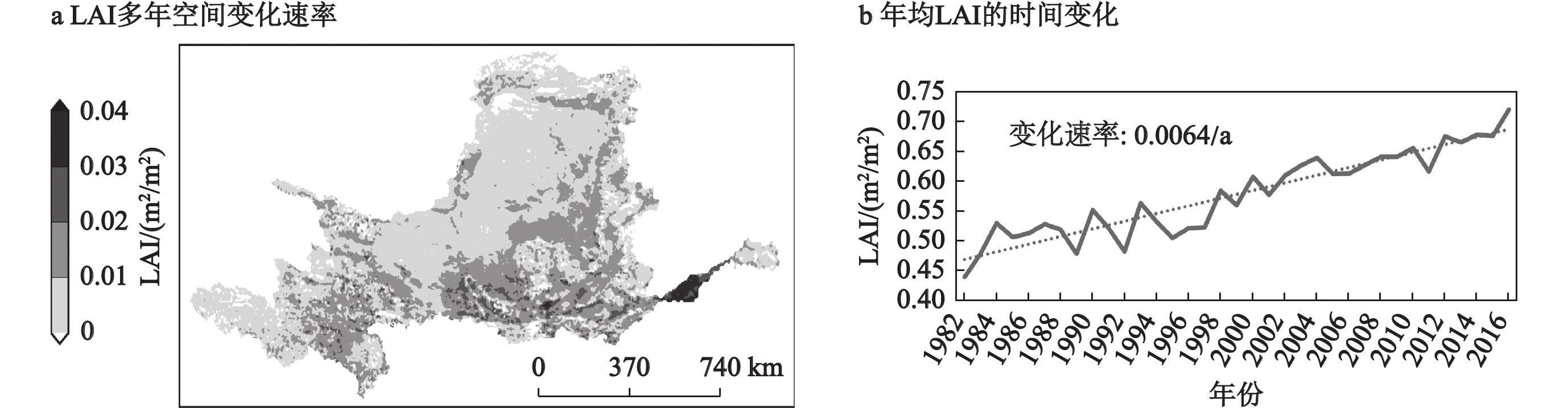 1982—2016年黄河流域(a)LAI(叶面积指数)多年空间变化速率和(b)年均LAI的时间变化