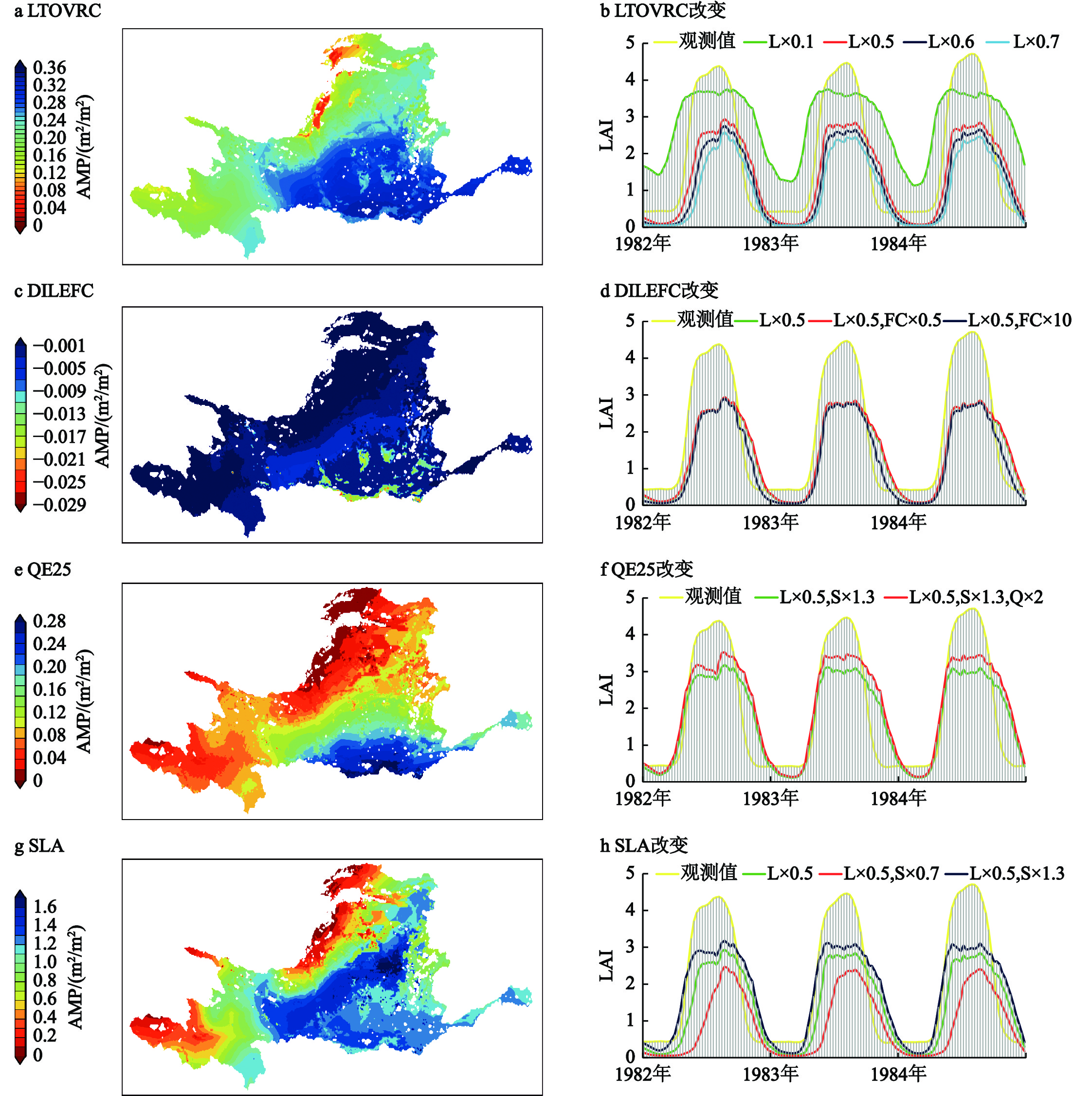 单个参数修改所产生的模拟LAI的敏感性偏差(a、c、e、g)和落叶阔叶林的LAI逐日时间序列(b、d、f、h)