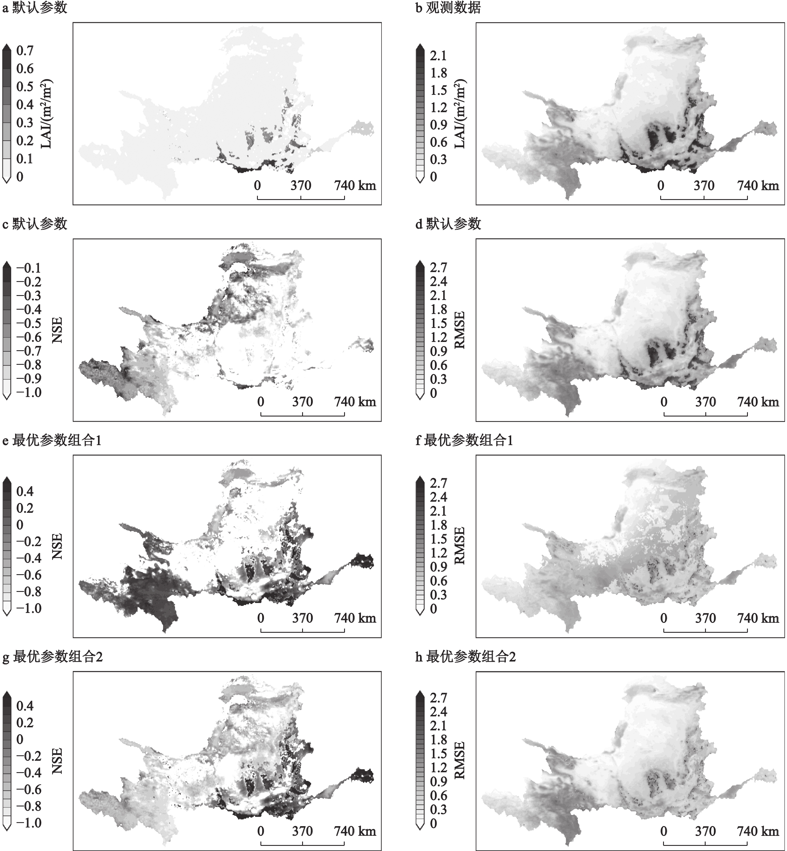 (a)默认参数和(b)GLASS LAI;1982—2016年Noah-MP在黄河流域模拟LAI(叶面积指数)的NSE(效率系数) 与RMSE(均方根误差)的空间分布:(c-d)默认参数,(e-f)最优参数组合1,(g-h)最优参数组合2