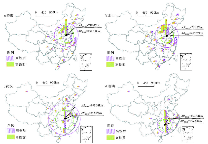 Fig.1 The distribution of tourist market and its attractiveness radius before, and after the open of high speed rail图1 高铁前后旅游地客源市场空间分布及吸引半径变化 |