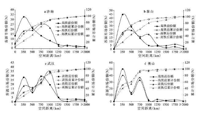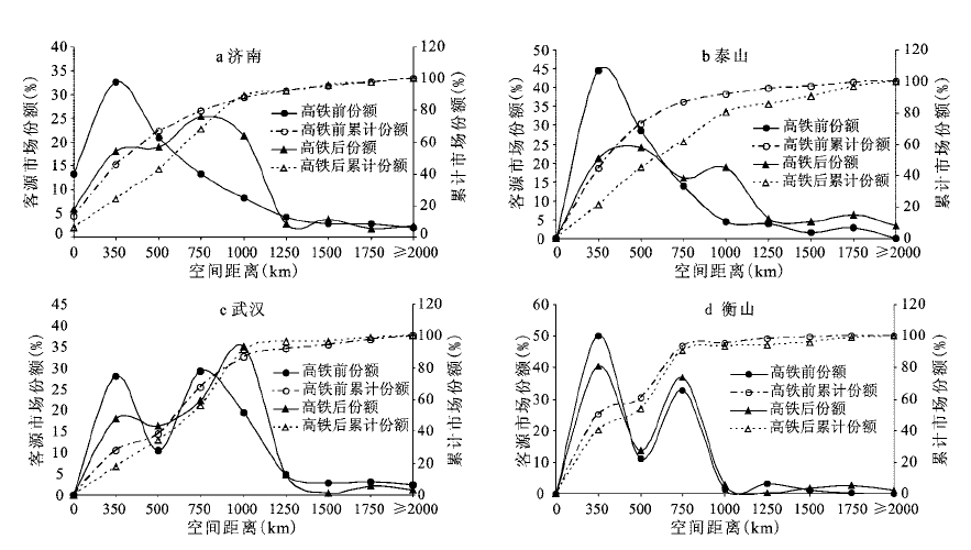 Transportation infrastructure is an indispensable prerequisite for developing tourism resources and constructing resorts, every new breakthrough in traffic technology allows the tourists to travel at a faster speed to a remoter destination. High speed rail (HSR) is a significant symbol of the worldwide “transportation revolution”, producing the remarkable effect of “space compression”. The “space compression” effect of HSR plays a significant role on the tourists’ travel space, thereby affecting the spatial structure of tourist source markets. On the basis of the case, Jinan, Taishan on Beijing-Shanghai HSR, and Wuhan, Hengshan on Wuhan-Guangzhou High speed rail, this article proves the impacts on the spatial structure of domestic source market by HSR from the point of attraction of spatial extent, spatial use curves of resorts, and spatial attractiveness of destination to source region, and concludes the new regularities of the tourist behaviors and spatial distribution of tourists in the age of HSR, laying the “cornerstone” for further study on the HSR’s impacts on the spatial pattern of regional tourism. The results show that: 1) the attractiveness radius of Jinan, Taishan, Wuhan, and Hengshan’s tourist market has been extended after the open of HSR. Therefore the number of source markets which may make large impacts on destination has increased, in particular, the number of major source markets that more significantly impact on the destinations, and the market share by remarkable margin. 2) The share of short-range source market has decreased obviously, while the medium, specifically the distance between 750 and 1 000 km, and long-range source market share have increased to different degrees. The 60% spatial extent of tourist markets have shown a trend of a significant expansion. 3) The “space compression” effect of HSR has improved the growth of attractiveness to tourist market, and the more remote of the distance, the more remarkable of the changes. The variability of attractiveness values and tourist demand have shown a significant correlation relationship. The change rate of spatial attractiveness value of destinations to tourist source and the change of tourist market demand are remarkably correlative, i.e. the more change of attractiveness, the more change of tourist market demand. It can also be seen that the effect of space compression produced by HSR exerts a significant accelerating function in the improvement of the attractiveness of destinations to tourist source markets, correspondingly promoting the significant growth of tourist market demand.