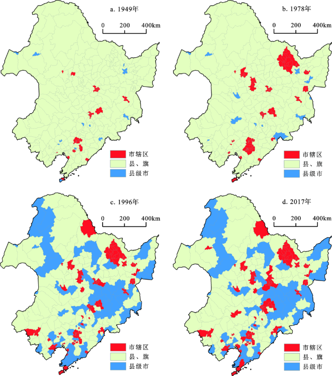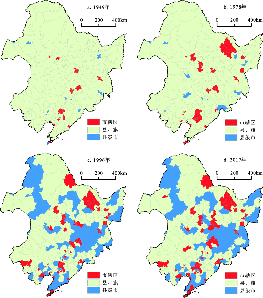 Fig.3 Evolution pattern of county-level administrative regions in Northeast China (1949-2017)图3 东北地区县级政区的演变格局(1949~2017年) |