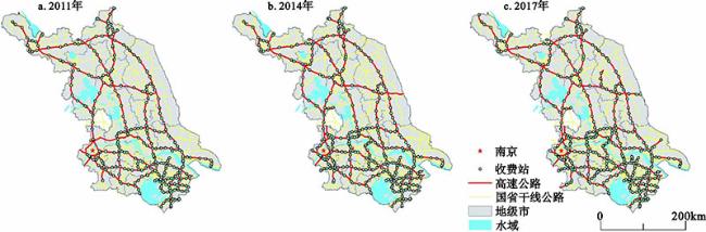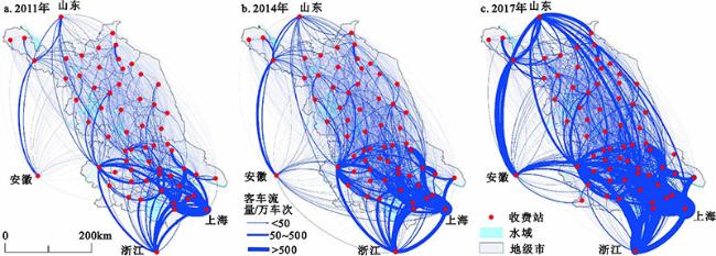 As an important part of modern transportation system, the huge traffic flow of expressway truly reflects the regional connection and has a profound impact on the social economy, people’s life and spatial structure. The massive expressway toll data collection is a significant support to analyse and reveal the traffic flow characteristics and the spatial structure evolution. According to the Jiangsu expressway toll collection data in 2011, 2014 and 2017, this paper selects car traffic to construct the O-D flow network and county connection network, so that the key toll stations and distribution characteristics of network degree are identified effectively, and the spatial pattern of car flow and the features of its network group structure are revealed. It is found that the spatial distribution of car flow shows a notable difference between the south and north of Jiangsu, with high-value points around the toll stations of central cities, provincial boundaries and cross-river bridges. The O-D flow network has an obvious scale-free feature, while the community structure is characterized by distribution along the expressway routes. The county connection network can be divided into 8 communities, with central cities as the cores.
