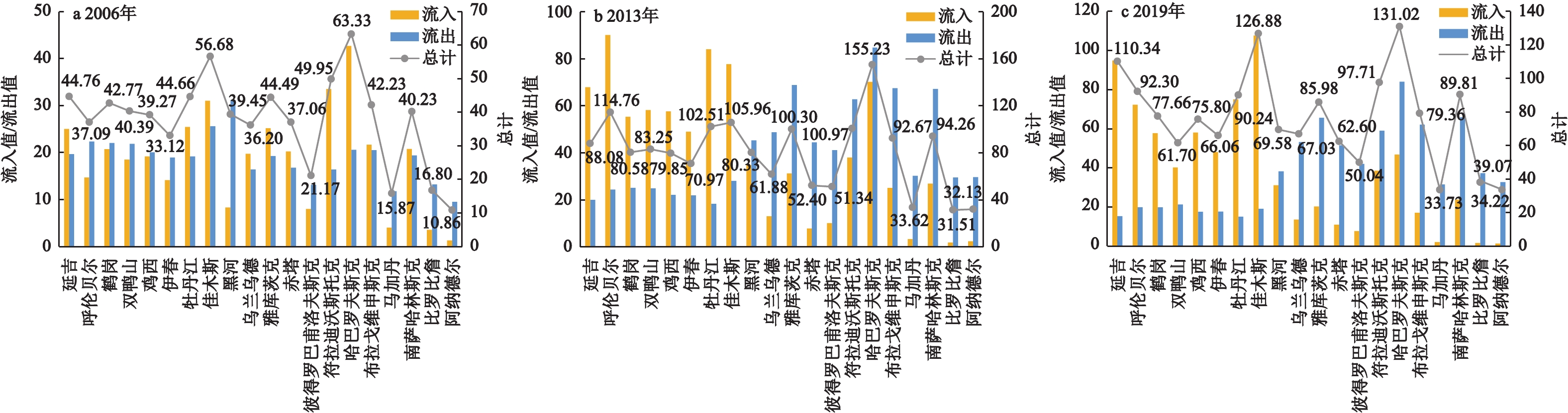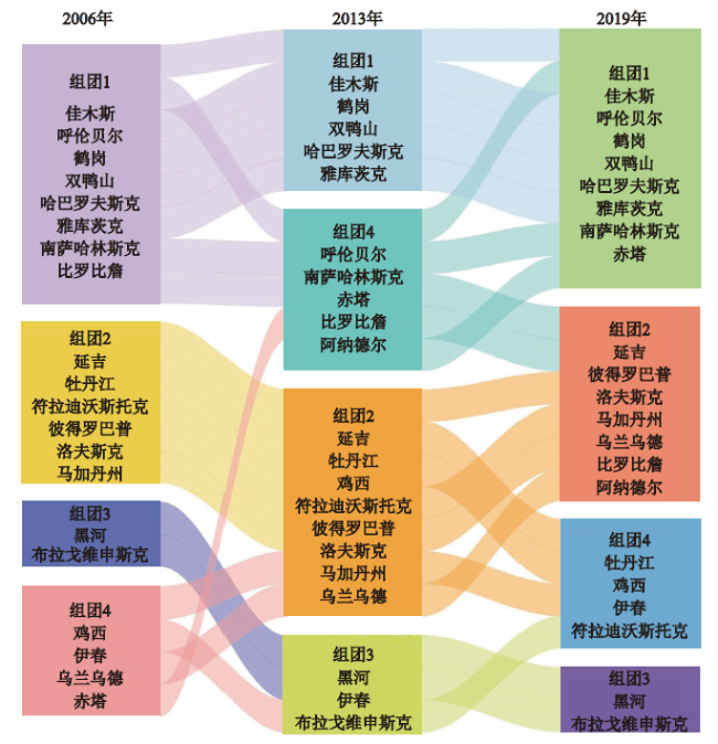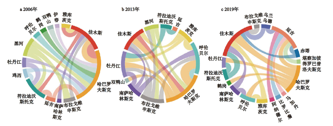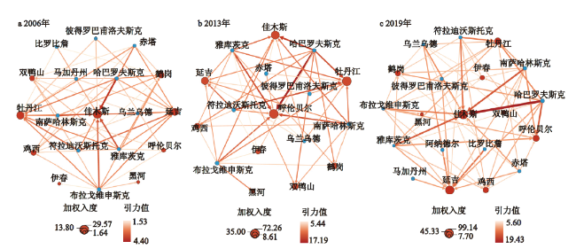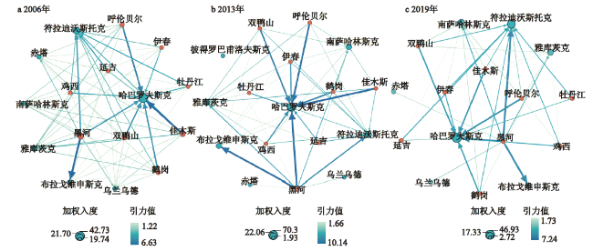 表2 中俄边境主要城市节点经济联系的中心性特征Table 2 Centrality of economic linkage among major cities in the China-Russia border regions in 2006—2019 |