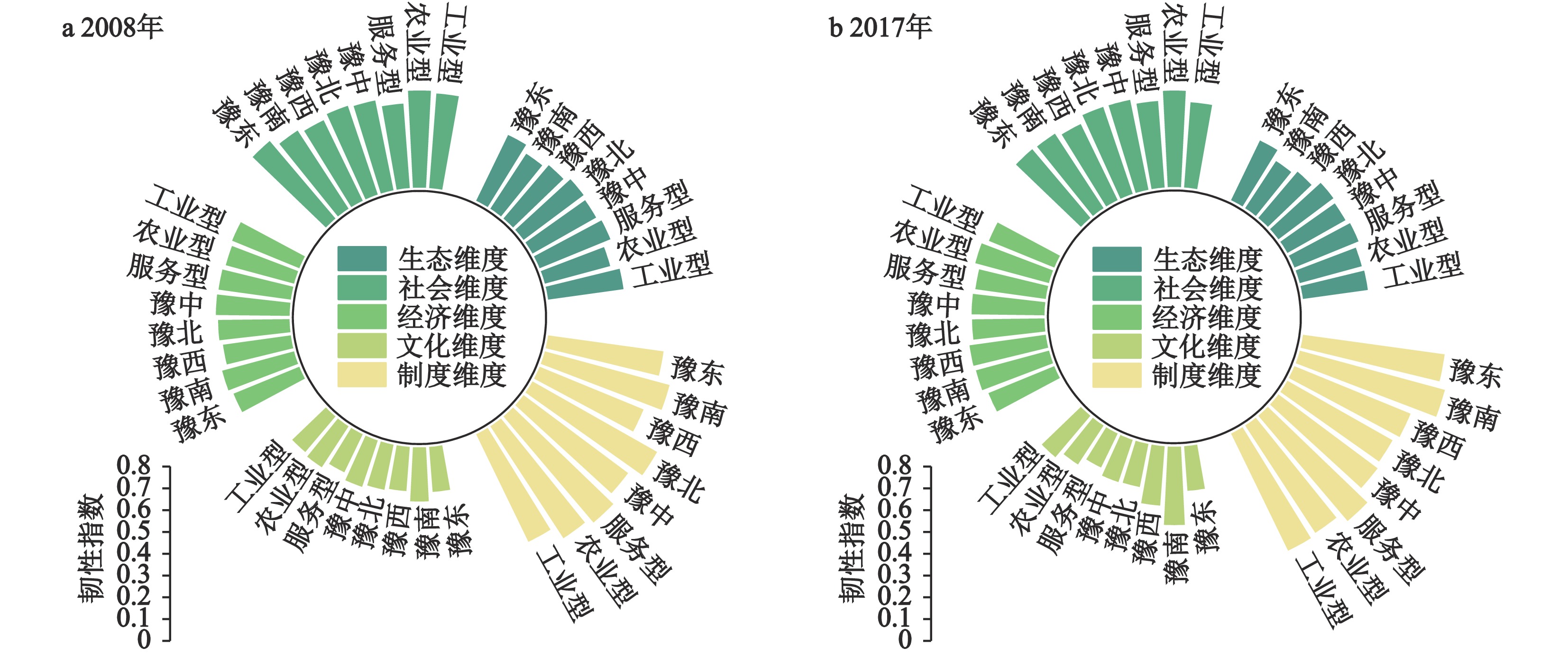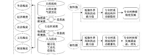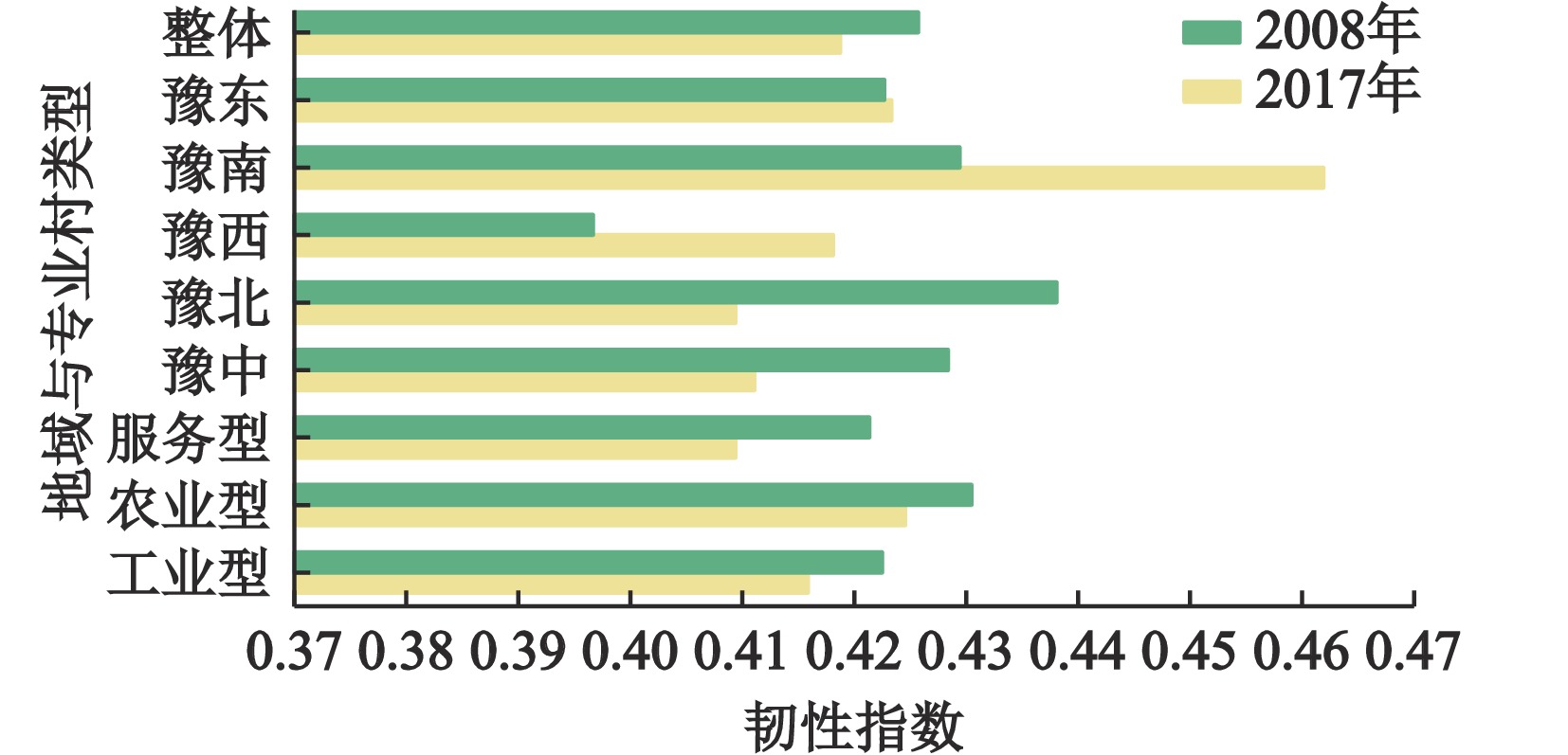 Specialized villages are the boosters of industrial prosperity and an important hand for rural revitalization. Studying the level of specialized villages' resilience and its evolution characteristics is of great significance for optimizing the specialized villages system, enhancing the economic development of agricultural areas, and promoting the implementation of the rural revitalization strategy. Based on the sample data of 50 specialized villages from 2008 to 2017 tracking survey in Henan Province, this article measures the resilience level of specialized villages and explores its evolution characteristics by constructing a specialized villages resilience evaluation index system and combining it with mathematical and theoretical models. The study shows that: 1) 56% of the comprehensive toughness of specialized villages in Henan Province is negative, concentrated in the northern part of Henan Province, the comprehensive toughness of the southern part of Henan Province has increased by nearly 10%, the toughness of service-type specialized villages has declined significantly compared with that of other types of specialized villages, and the area of high value of toughness of agricultural-type specialized villages has shifted from the east to the south. 2) Institutional toughness contributes most to the comprehensive toughness of specialized villages. The ecological toughness of 78% of the specialized villages in Henan Province declined, concentrated in the east of Henan. The cultural toughness and ecological toughness in central Henan Province have both decreased by about 10%, and the cultural toughness and economic toughness in southern and western Henan Province have both increased by more than 35%, with growth hotspots evolving from central and eastern Henan Province to western and southern Henan Province. Industrial-type specialized villages' cultural resilience increased by 16%, but ecological resilience declined by nearly 14%. Service-oriented specialized villages' cultural toughness declined by more than 10%. 3) The cultural dimension is the main short-board element affecting the comprehensive toughness of each type of specialized villages, and the amount of export foreign exchange, the annual sales income of the leading industries, the annual average electricity consumption of rural households, and the per capita water area are specific limiting factors.