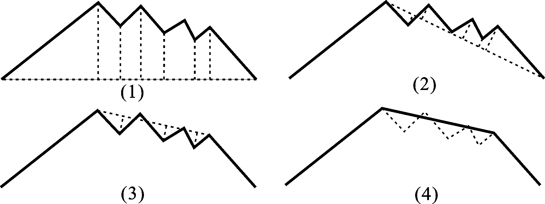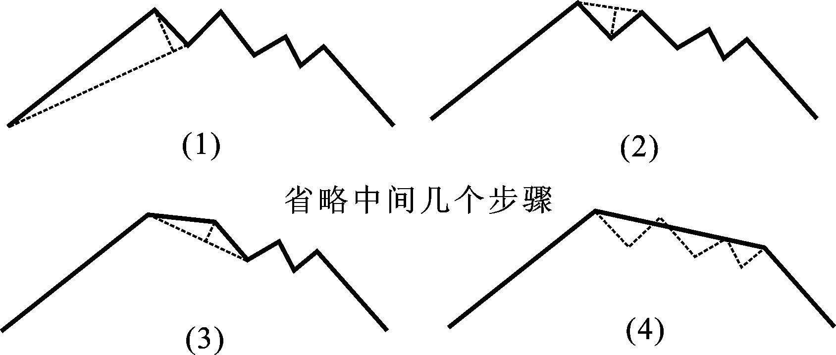 面积偏差控制下的线段动态拟合法的基本思想是以垂直限距法为基础,对曲线段进行线段动态拟合,使新拟合线段最大程度在空间上逼近这个曲线段的中心轴,从而解决地理空间数据传统压缩算法产生的面积偏差以及线段的空间偏移过大的问题。其实现的具体步骤如下:
