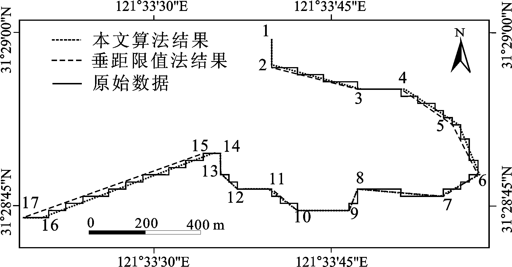 选用比例尺1:10万的崇明县岛屿轮廓扫描矢量化图作为实例,分别采用垂距限值法和本文算法进行了压缩试验(垂距限值算法与道格拉斯算法在面积偏差方面无本质区别[8,9,13],仅采用其中一种算法试验),垂距限值都设定为30 m,本文算法增加面积偏差限值,设定为5.0 m。图4为两种不同算法计算结果与原始数据对比图。
