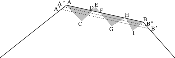 式中,S△EDF正值,其他为负值。如果s<Sε,线段AB作为曲线段ACEGHIB的压缩结果进行保留,中间点全部删除;如果 s>Sε,对线段AB进行空间动态平移和小角度旋转得A″B″,计算直线A″B″与曲线段ACEGHIB的交点坐标,进行面积偏差计算,反复平移不断拟合,直至满足s<Sε为止。线段A″B″作为曲线段ACEGHIB的压缩结果进行保留,原曲线段ACEGHIB全部删除。计算时需同时取得A点的前一点坐标与B点的后一点坐标,用于拟合计算直线与曲线段的交点A″点与B″点(见图3)。
