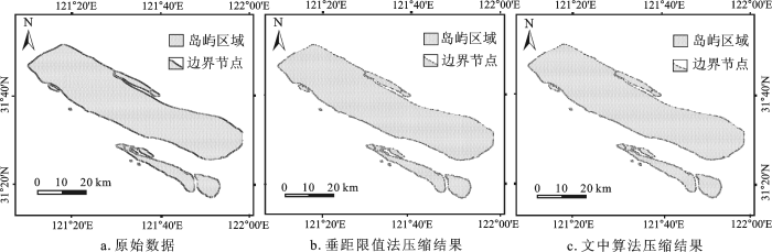 原始数据全部节点数11 901个,数据格式为Mapinfo的mif格式,数据量252 KB,岛屿区域面积为1 505 km2。垂距限值法压缩后,节点数为1 630个,数据量34.5 KB,压缩比为7.3,区域面积计算为1 549 km2 ;文中算法压缩后,节点数为1 653个,数据量35.1 KB,压缩比为7.2,区域面积计算为1 506 km2。