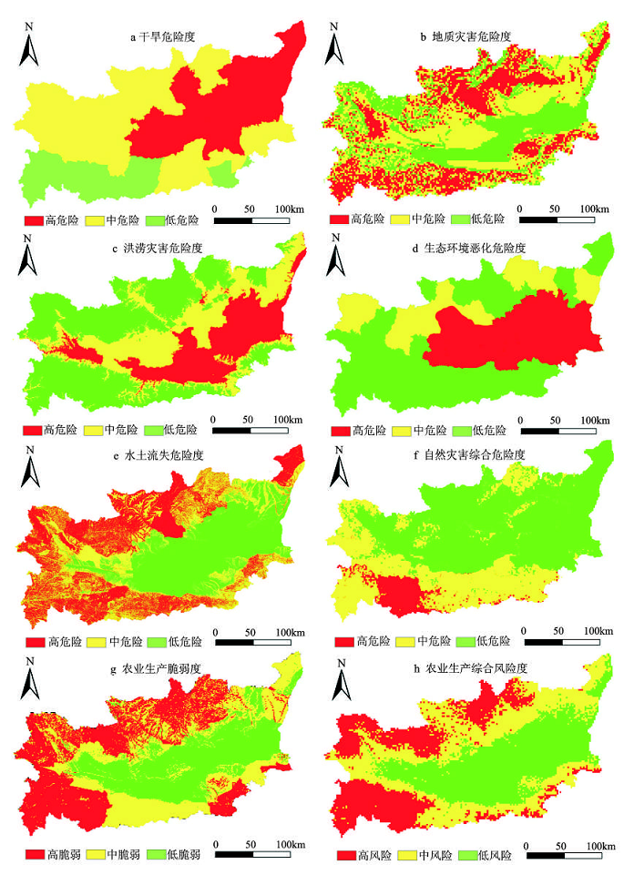 区域农业生产可能面临旱灾、洪涝灾害、地质灾害、水土流失以及农业生态环境恶化等灾害的共同威胁,因此自然灾害危险度H以加权综合指数法计算: