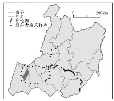2009年7月31日至8月11日,在呼伦贝尔地区开展了为期12 d的野外科学考察,考察范围包括10个市/旗,在研究区域内共获取有效野外考察采样点110个。采样过程中每个样点记录的信息包括:定位点的经纬度、海拔高度、样点的植被类型、两张代表性样点照片(1张远景、1张近景)以及照片编号。