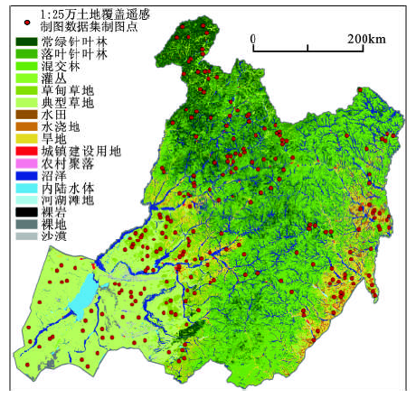 Fig.2 The 1:250 000 land cover dataset and the mapping points of vegetation in study area