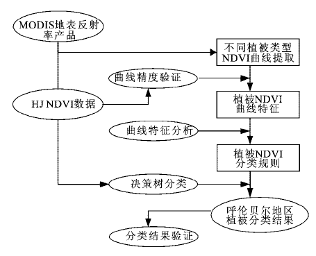 Vegetation is critical for researches about global environmental change and regional sustainable development, and remote sensing is an important method for obtaining classification result. However, the Normalized Difference Vegetation Index (NDVI) time series method classification was limited by the coarse spatial resolution, and application of the medium high data such as Landsat TM was limited by the coverage and accessibility of remote sensing data. The Chinese environmental mitigation HJ satellite CCD sensors are capable of large area, all-time monitoring, and have a great advantage in coverage and frequency of repeated observations. A case study of Hulunbuir, Inner Mongolia was carried out in this paper. The NDVI time series curve of 7 vegetation types were extracted from both MODIS and HJ CCD data. Then, the curves and eigenvalue were analyzed. The result showed that between the 7 vegetation types, there was significant differences in the value range of early May NDVI, early August NDVI and the ratio of the two NDVI image. The vegetation classification rules were extracted based on these differences. The HJ-CCD was used as the main data sources in this paper. Three images including two NDVI and one ratio were extracted and the decision tree method was applied. Based on the result, 30 m spatial resolution vegetation classification result was carried out. By field verification, the result shows a 83.64% overall accuracy in the level one classification, and 70.91% in the level two classification. The cartographic accuracy of evergreen coniferous forest can achieve 100%, followed by cropland 82.61%, mixed forest 76.19% and desert steppe 75%. The accuracy of shrub is relatively low to 50%. This result proved a fast, simple and accurate method for vegetation classification, and provided the theory and data support for application of the Chinese HJ satellites.